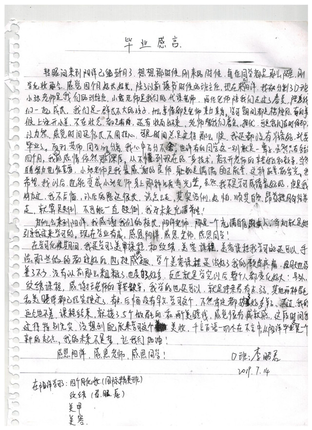 當前位置:樂清市陽洋職業(yè)技能培訓學校 » 學員感悟李昭君同學畢業(yè)感言發(fā)布時間:2019-8-13 20:15:43瀏覽次數(shù):1951 |