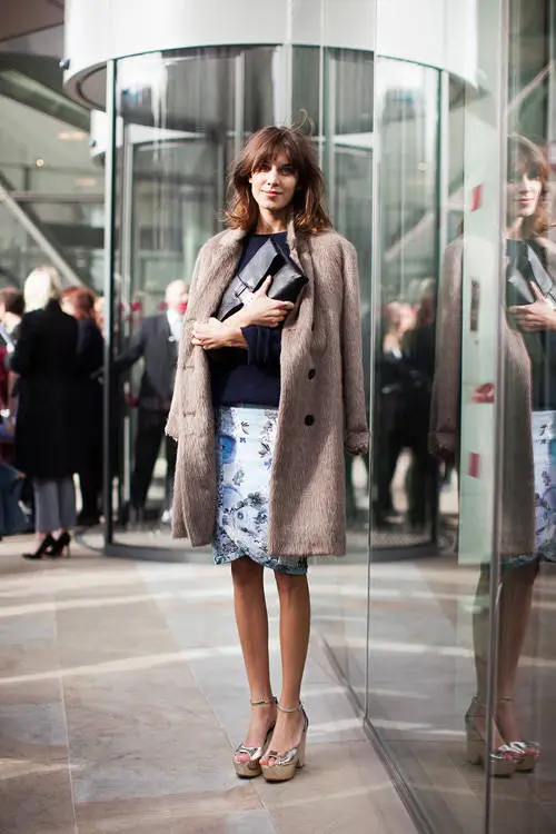 NO.3:質(zhì)感至上 It girl艾里珊·鐘向來都是街拍潮流風(fēng)向標(biāo),一件毛衣古風(fēng)半裙毛絨絨的輕奢皮草大衣,干練簡約的手拿包,搭配簡約隨意,深淺跌宕,配上隨性卷發(fā),讓人舒服至極。