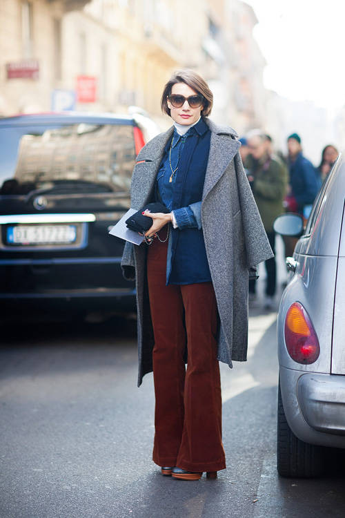 NO.9:面料的混搭 沒有什么比面料混搭更有趣的了,從色彩到質(zhì)感都碰撞起來,才能營造出時尚大爆炸的感覺,磚紅色的燈芯絨喇叭褲打造最地道復(fù)古范兒。