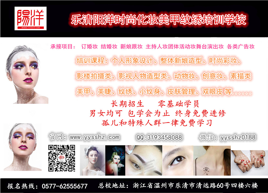浙江省樂(lè)清市陽(yáng)洋時(shí)尚化妝職業(yè)技能培訓(xùn)學(xué)校是樂(lè)清市人力資源和社會(huì)保障局審批的一家正規(guī)化妝培訓(xùn)學(xué)校、是以彩妝、美甲、盤(pán)發(fā)、紋繡、形象設(shè)計(jì)培訓(xùn)為主導(dǎo)的綜合性、專業(yè)化培訓(xùn)學(xué)校。辦學(xué)經(jīng)驗(yàn)豐富、師資一流、信譽(yù)度高、設(shè)施完善,學(xué)校的教學(xué)方針為了配合國(guó)家文化部門(mén)對(duì)文藝事業(yè)的發(fā)展需求!培養(yǎng)新時(shí)代的時(shí)尚、培訓(xùn)的宗旨是尊尋人才、培養(yǎng)人才、推出人才,服務(wù)時(shí)尚、影視圈。 ![]()