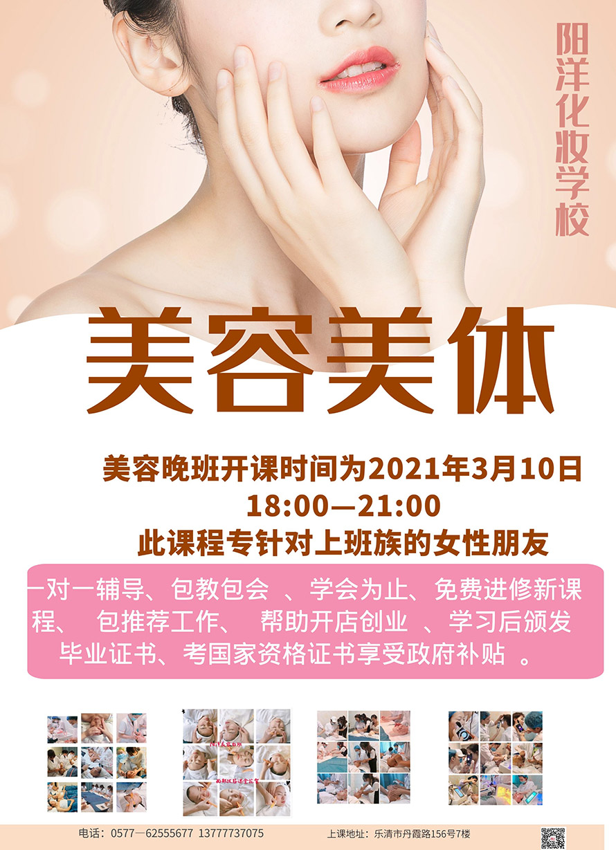 白天上班,晚上來學習美容啦 學習后在學??紘易C書,包分配工作 已報名同學請于3月10日晚6點前,到樂清丹霞路156號7樓報道學習 備注:帶上身份證、1寸白底照片2張,用于畢業(yè)后頒發(fā)畢業(yè)證書