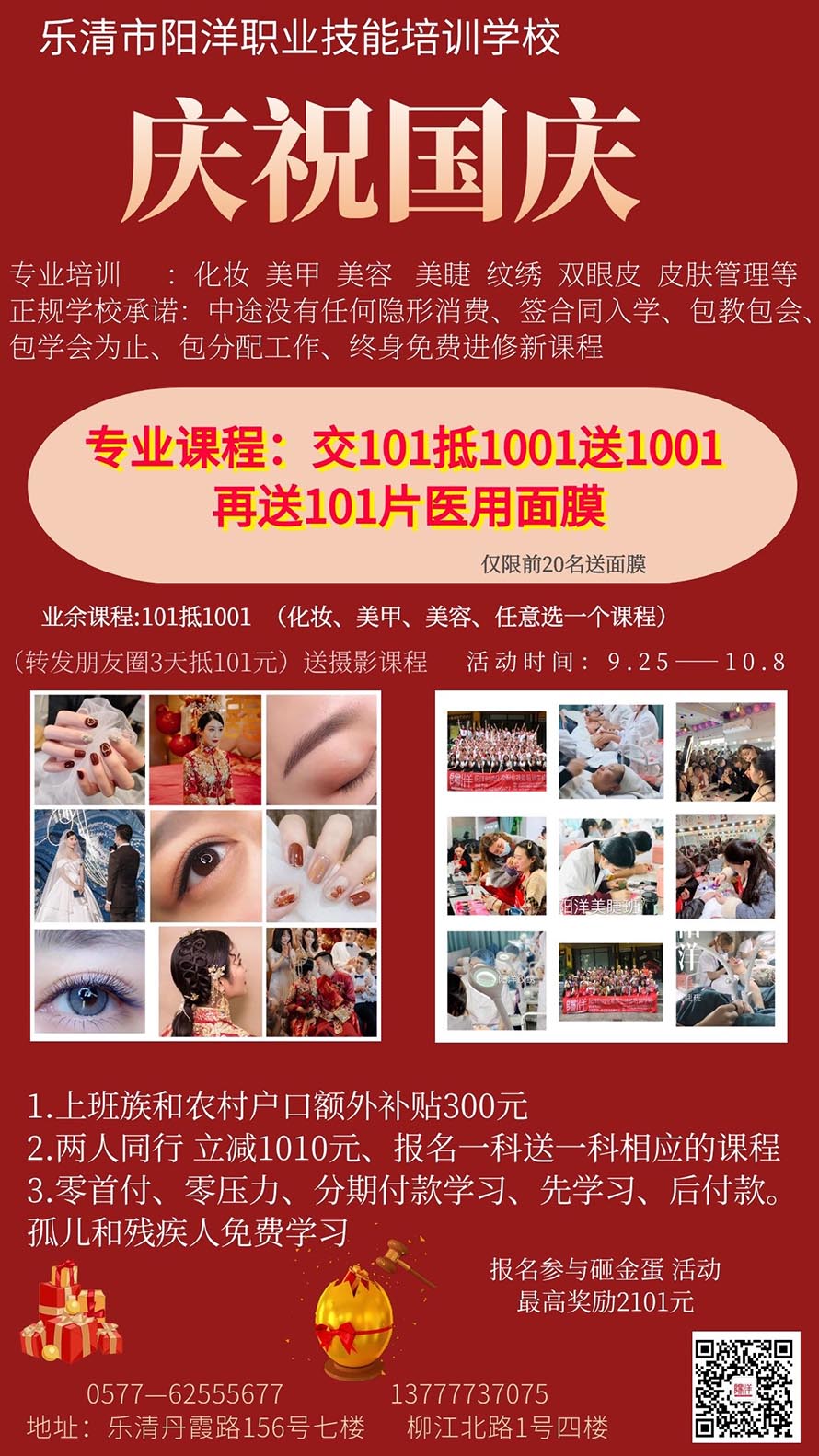 當(dāng)前位置:樂(lè)清市陽(yáng)洋職業(yè)技能培訓(xùn)學(xué)校 » 學(xué)校新聞陽(yáng)洋2021國(guó)慶活動(dòng)火爆來(lái)襲#溫州樂(lè)清柳市虹橋哪里有學(xué)化妝美甲紋繡美睫美容?發(fā)布時(shí)間:2021-9-26 9:52:36 瀏覽次數(shù):1951 |