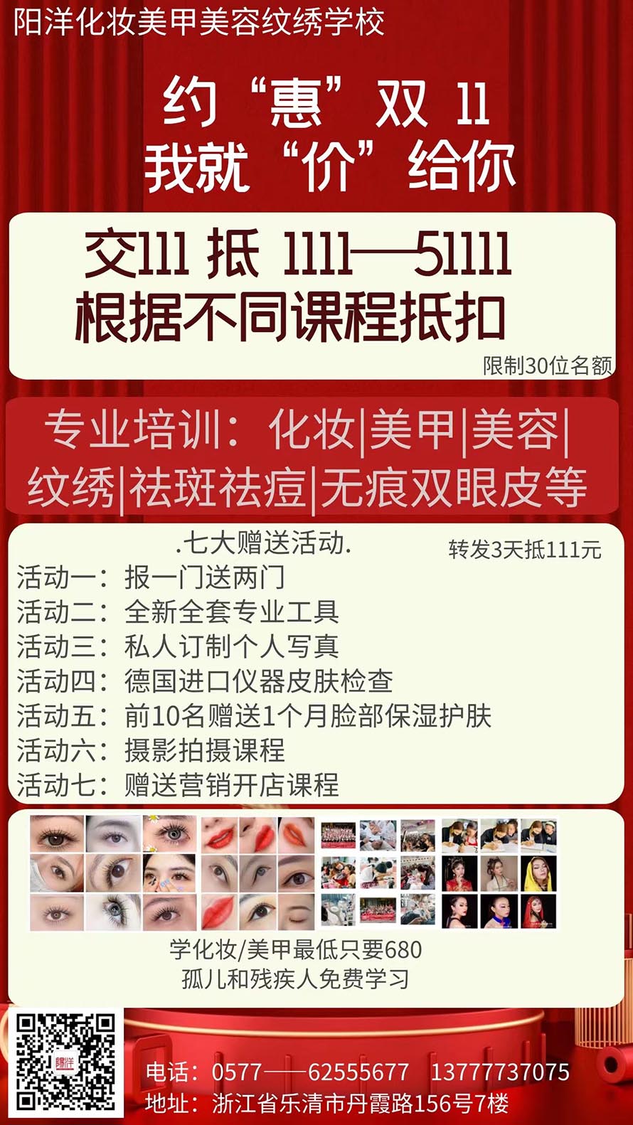當(dāng)前位置:樂清市陽洋職業(yè)技能培訓(xùn)學(xué)校 » 學(xué)校新聞樂清哪里有學(xué)化妝?陽洋化妝學(xué)校雙十一活動火熱來襲!交111抵1111到5111元發(fā)布時間:2022-10-27 14:06:33 瀏覽次數(shù):1948 |