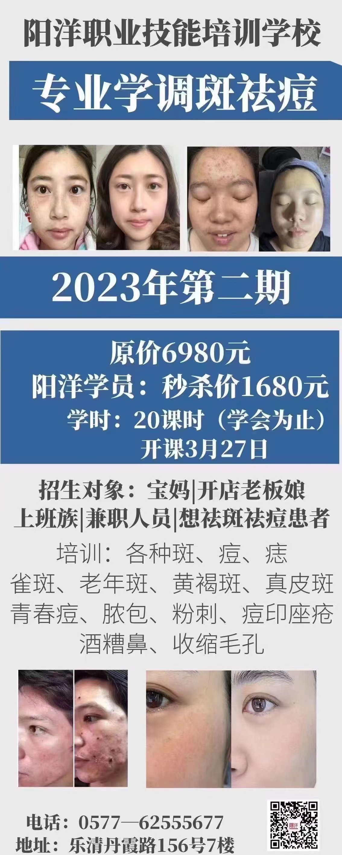 當(dāng)前位置:樂(lè)清市陽(yáng)洋職業(yè)技能培訓(xùn)學(xué)校 » 學(xué)校新聞樂(lè)清哪里有學(xué)祛斑祛痘?樂(lè)清陽(yáng)洋祛斑祛痘班開(kāi)班啦發(fā)布時(shí)間:2023-3-23 12:13:57 瀏覽次數(shù):1949 |