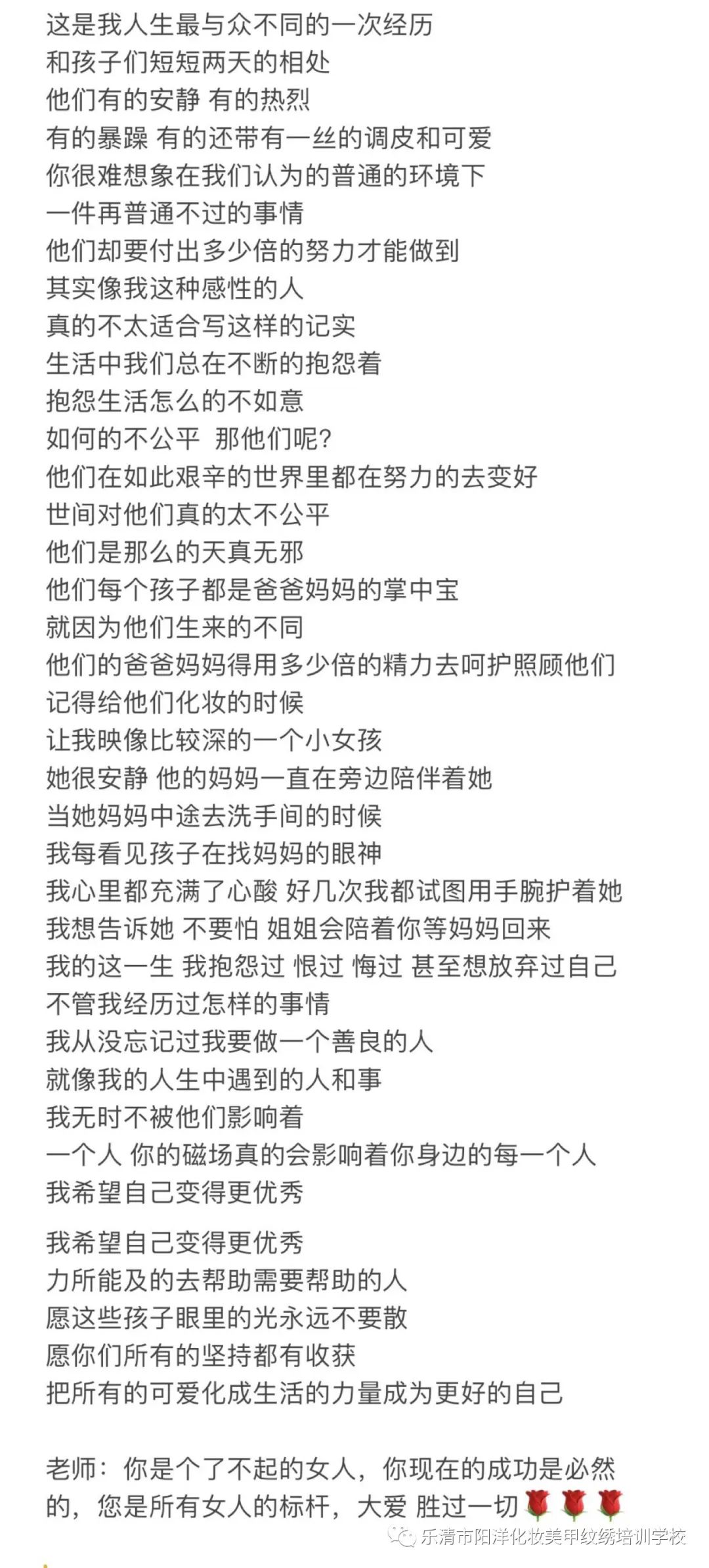 特別感謝化妝師欣然的分享,陽(yáng)洋化妝學(xué)校會(huì)幫助更多人的同時(shí),楊老師也會(huì)帶領(lǐng)號(hào)召更多的老師投身公益事業(yè)當(dāng)中去