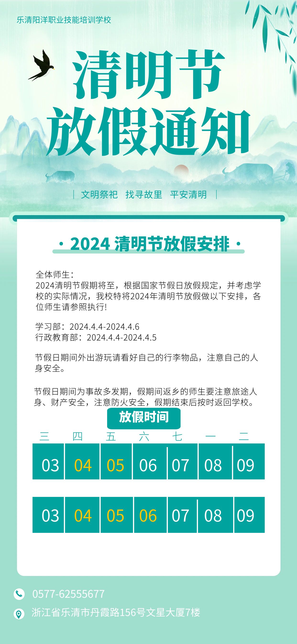當(dāng)前位置:樂(lè)清市陽(yáng)洋職業(yè)技能培訓(xùn)學(xué)校 » 學(xué)校新聞清明放假通知發(fā)布時(shí)間:2024-4-2 9:06:25 瀏覽次數(shù):1951 |