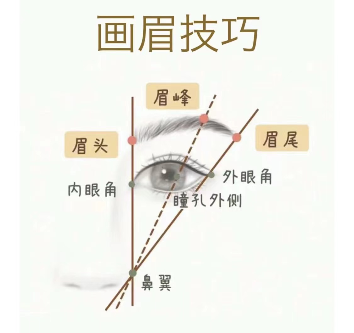 眉頭的位置:鼻翼和內(nèi)眼角的垂直延長線上 眉峰的位置:鼻翼和瞳孔外側(cè)的延長線上 眉尾的位置:鼻翼和外眼角的延長線上