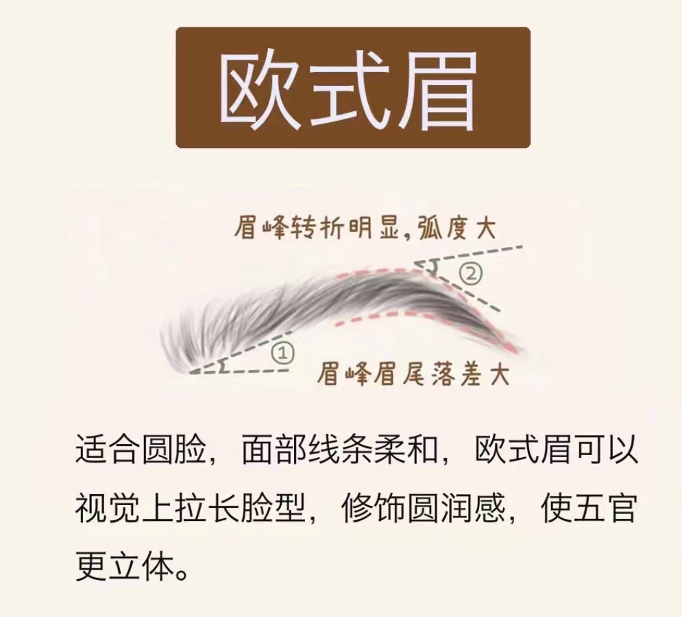畫法技巧: 眉峰適當(dāng)后移,拉長眉尾,可以拉寬額頭比歐式眉轉(zhuǎn)折弧度更柔和,更適合亞洲人眉腰上揚角度①約30°,眉尾下落角②約40° 眉毛不宜太粗,防止上面部量感太重 ![]()