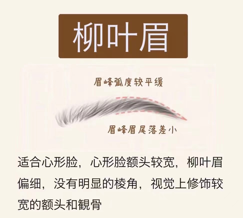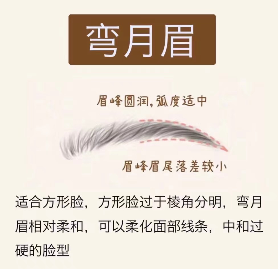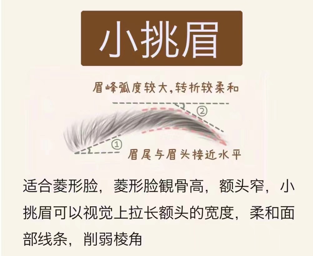 畫法技巧: 眉頭最寬,呈方圓形 眉峰弧度較大,但沒有小挑眉弧度大眉尾自然收窄,略高于眉頭