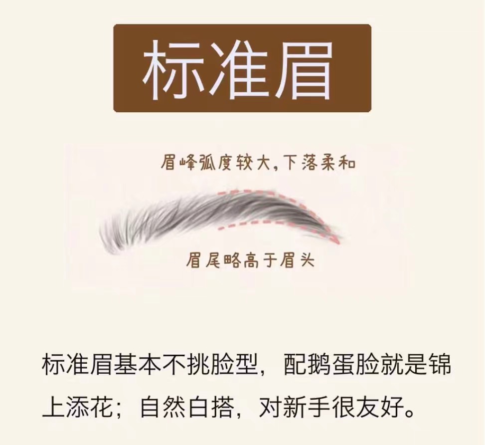 畫法技巧: 眉毛整體定點與標(biāo)準(zhǔn)眉比較接近 眉峰到眉尾自然向下,眉峰較為圓潤 眉毛整體線條柔和,粗細(xì)均勻,弧度適中 ![]()