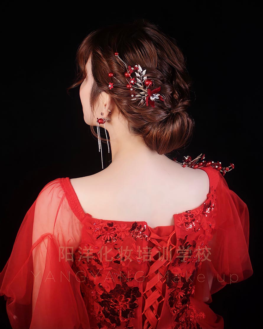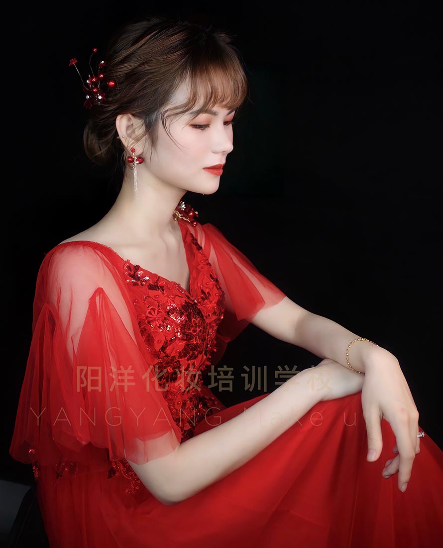 紅色禮服搭配精致發(fā)飾 ,清透的底妝加上深色口紅 甜美和明艷動人感 ,隨意切換
